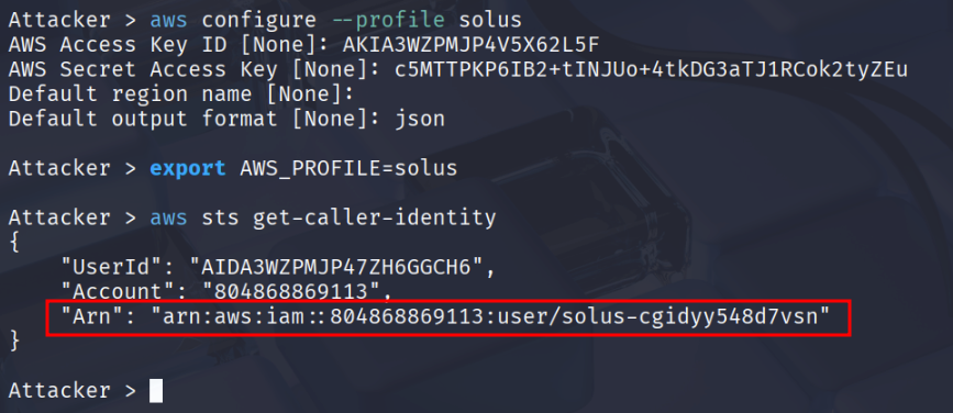The ARN contains the username in the after :user/, it will be unique in each deployment. I’ll export it as an environment variable to make the cheat sheet clearer. export IAM_USERNAME=solus-cgidyy548d7vsn
